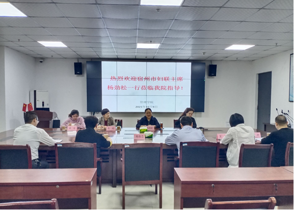 10月9日上午,宿州市妇女联合会党组书记、主席杨劲松一行莅临管理学院考察交流并洽谈合作事宜。管理学院院长韩传龙,教授王淑霞、宋徽,副教授武永成、周冲等参加交流座谈。
