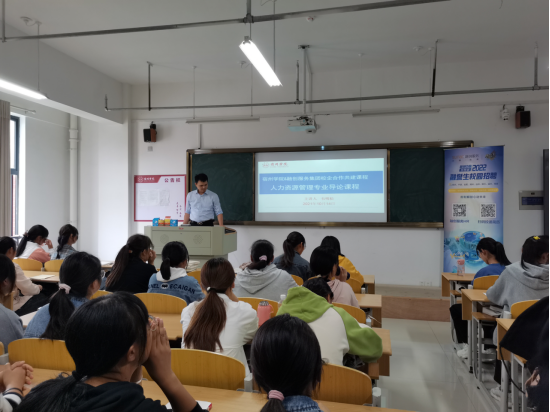 为深化校企合作,共建精品特色课程。2021年10月14日管理学院开设人力资源管理专业暨融创服务集团校企合作课程之专业导论课程。本次授课由工商管理教研室主任周冲主持,融创服务集团人力资源部经理韦明松主讲,2021级人力资源管理班全体学生参与。