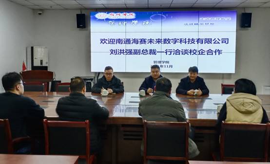2021年11月29日下午,南通海赛未来数字科技有限公司刘洪强副总裁一行来管理学院洽谈校企合作事宜。管理学院院长韩传龙,副院长宋徽及部分教研室主任、博士参加了座谈会。