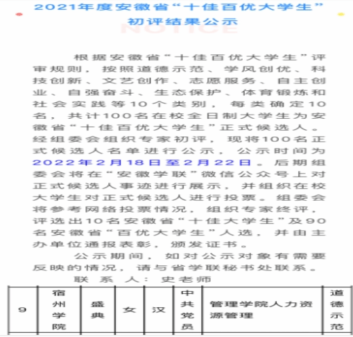 近日,安徽省学生联合会公示2021年度安徽省“十佳百优大学生”初评结果,根据其评审规则,按照道德示范、学风创优、科技创新、文艺创作、志愿服务、自主创业、自强奋斗、生态保护、体育锻炼和社会实践等10个类别各确定10名“十佳百优大学生”正式候选人,我院学子盛典入选其中。