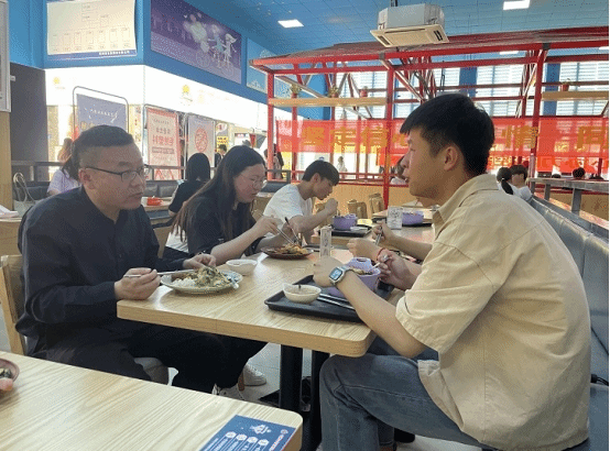 为了加强师生之间的日常交流,拉进师生距离,有效提高学生的生活质量,切实提供有效帮扶,5月5日中午,院党委书记蔡若愚走进餐厅与21级人管专升本一班的学生共进午餐。