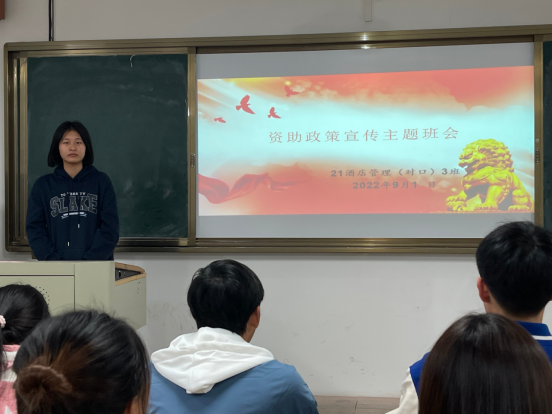 为加强学生资助政策宣传力度,确保国家资助政策落到实处,营造积极进取、奋发向上的良好氛围。2022年9月1 日,21酒店管理3班在管理学院c215教室召开“资助政策进班级”主题班会。班会由辅导员徐蒙主持,班级全体同学参加。