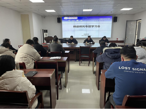2023年2月22日,管理学院在教育园区实训楼C301召开师德师风专题学习会。院党委书记蔡若愚,院党委副书记、院长韩传龙,院党委副书记张增林,副院长(教学)宋徽及全院教师参加,会议由韩传龙主持。