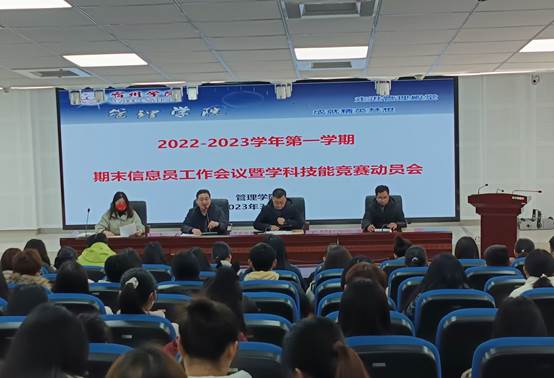2023年3月2日中午,管理学院信息员会议暨学科技能竞赛动员大会在实训楼C103教室召开。管理学院党委书记蔡若愚,党委副书记、院长韩传龙,党委副书记张增林,副院长宋徽,学院各科室负责人以及各班班长、团支书、科创委员参加了本次动员大会。