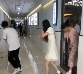 在应急逃生疏散演练环节,演练现场在实训楼C楼4楼进行,模拟楼内火灾情况下的疏散演练。工作人员使用哨子模拟楼内警报系统启动,学生启动既定疏散流程,楼内各疏散口、楼梯口等重点区域引导员迅速就位,引导学生沿疏散标识所示方向有序完成疏散。