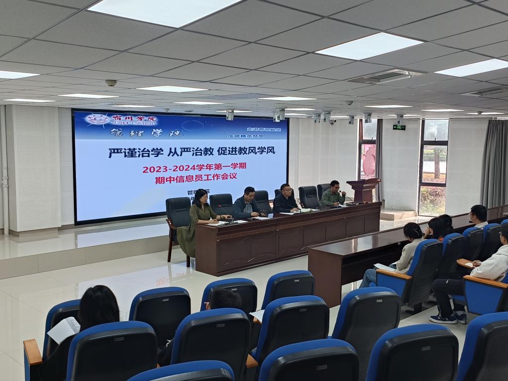 为加强期中教学管理,不断提高学院教育教学和管理工作的质量,及时了解教师和学生教与学的情况,学生自我管理和行政管理等相关工作中的亮点以及需要加强改进的问题,充分发挥学生参与教育教学管理的主动性和积极性,按照校、院相关文件精神及工作计划安排,管理学院于2023年10月27日13点在实习实训楼C103召开2023-2024学年第一学期期中教学信息员工作会议。2021、2022、2023级各班级信息员参会,会议主题为“严谨治学,从严治教,促进教风学风”。院党委书记蔡若愚、院长韩传龙、党委副书记张增林、教学副院长宋徽、各教研室主任及相关工作负责人参会,院长韩传龙主持会议。