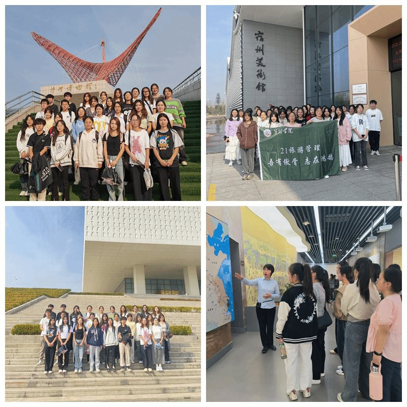 第二阶段为实践体验活动。2021级旅游管理44名学生先后赴宿州城市规划馆、宿州市科技馆、宿州市博物馆、宿州市美术馆、宿州市汴河博物馆等进行研学考察;2022级旅游管理29名学生先后赴宿州市博物馆、宿州城市规划馆和宿州市汴河博物馆等进行学习,学习展馆优秀讲解员的讲解魅力,领略地方文化底蕴。