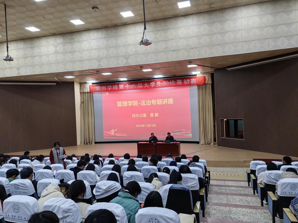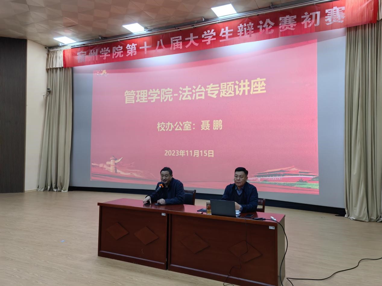 随着社会的不断发展,法治观念的重要性日益凸显。为深入学习宣传党的二十大精神,贯彻依法治国理念,加大校园法治教育宣传力度,提升青年学子法治意识和法治素养,增强学法、尊法、守法、用法的观念,营造文明、平安、和谐的校园育人环境,推进依法治教、依法治校和依法办学,提升师生法治素养,2023年11月15日,宿州学院法治科科长聂鹏在大学生活动中心开展了一场针对性强、实用性高的法治教育专题讲座——“争做新时达尊法、学法、守法、用法的大学生”。管理学院2023级全体新生、各班法治宣传员参加了讲座。讲座由管理学院院长韩传龙主持。