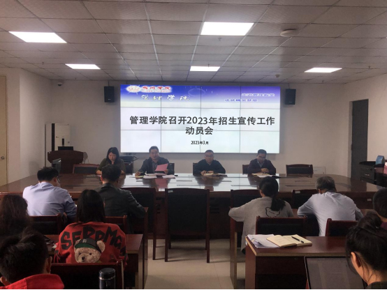 2023年3月,管理学院在实习实训楼C301召开2023年招生宣传动员会,院长韩传龙主持会议,院党委书记蔡若愚、各教研室主任及全体教职工参加会议。
