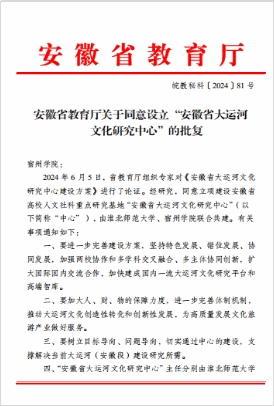 近日,安徽省教育厅下发了《安徽省教育厅关于同意设立“安徽省大运河文化研究中心”的批复》(皖教秘科〔2024〕81 号),同意立项建设安徽省高校人文社科重点研究基地“安徽省大运河文化研究中心”,由淮北师范大学、宿州学院联合共建,一个机构,两块牌子。