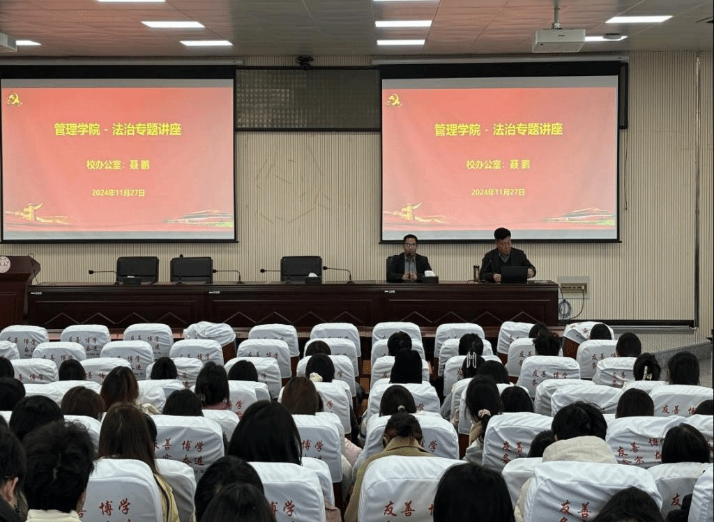为深入学习宣传党的二十届三中全会精神,贯彻依法治国理念,加大校园法治教育宣传力度,帮助大学生更好地树立正确的法治观念,营造尊法、学法、守法、用法的校园氛围,2024年11月27日下午,管理学院邀请校办法治科科长聂鹏在逸夫楼第二会议室为2024级新生作法治教育专题讲座。学院2024级新生、各班法治宣传员参加了讲座。讲座由学院党委副书记、纪委书记张增林主持。