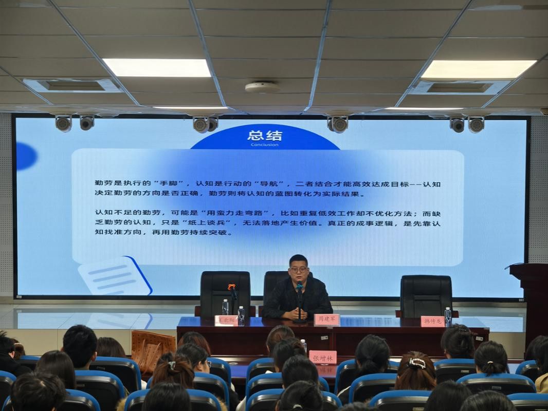 周建军结合自身多岗实践、深耕领域的工作经历,指出创业不仅要具备扎实的专业能力、勤奋的工作态度、严谨的职业素养与持续的创新精神,更要具备挑战传统观念、突破行业局限的勇气和前瞻迭代的多维认知,这是创业者的动力源泉;他还勉励学弟学妹珍惜成长机会、打磨专业能力以实现全方位提升,提醒大家及时更新知识技能、保持学习热情以增强竞争力,为创业与人生发展奠定良好基础。互动问答环节,同学们围绕创业、就业、考研等方面踊跃提问,周建军耐心解答并给出针对性建议。