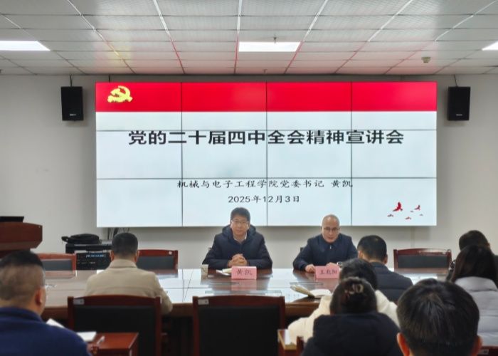 12月3日,在校党委宣传部的组织安排下,机械与电子工程学院党委书记黄凯应邀到管理学院专题宣讲党的二十届四中全会精神。管理学院全体党员教师和部分学生党员代表参加,管理学院党委书记王北阳主持宣讲会。