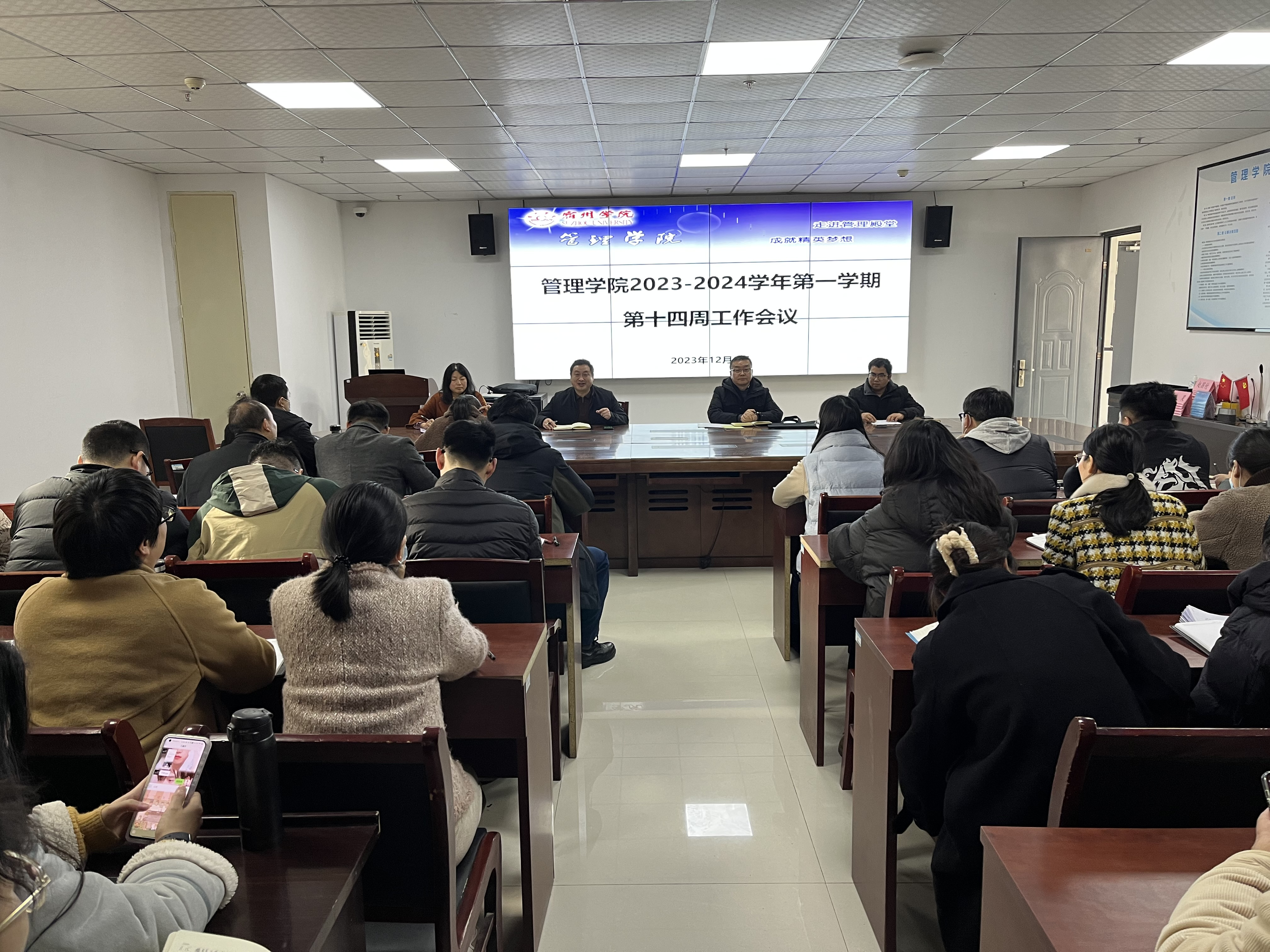 2023年12月6日,管理学院在教育园区实训楼C301召开2023-2024学年第一学期第十四周工作例会。院党委书记蔡若愚,院党委副书记、院长韩传龙,院党委副书记张增林,副院长(教学)宋徽及全院教师参加,会议由韩传龙主持。