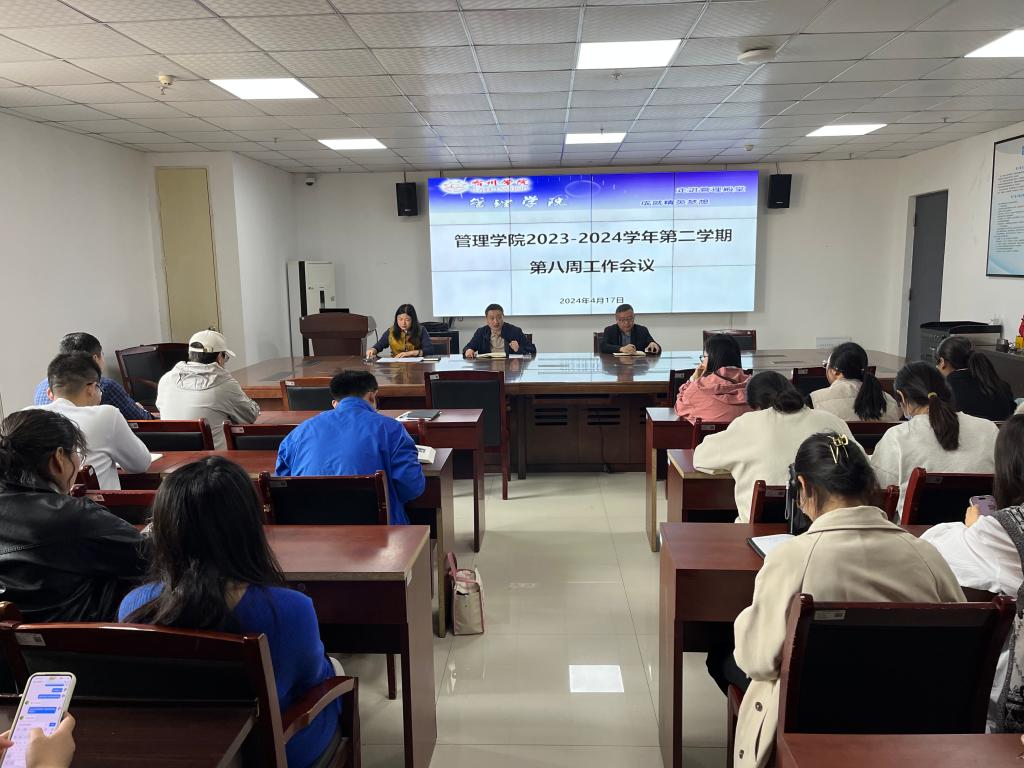 2024年4月17日,管理学院在教育园区实训楼C301召开2023-2024学年第二学期第八周工作例会。院党委书记蔡若愚,院党委副书记、院长韩传龙,副院长(教学)宋徽及全院教师参加,会议由韩传龙主持。