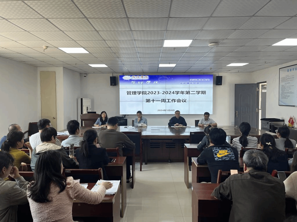 2024年5月8日,管理学院在教育园区实训楼C301召开2023-2024学年第二学期第十一周工作例会。院党委书记蔡若愚,院党委副书记、院长韩传龙,院党委副书记、纪委书记张增林,副院长(教学)宋徽及全院教师参加,会议由韩传龙主持。