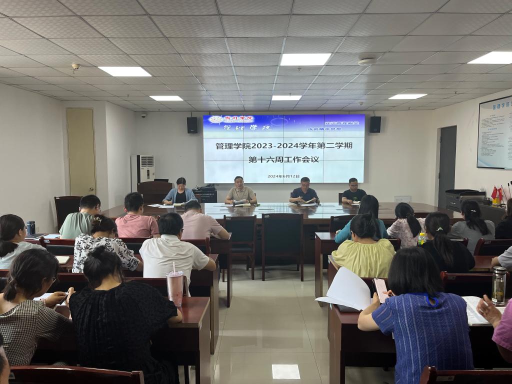 2024年6月12日,管理学院在教育园区实训楼C301召开2023-2024学年第二学期第十六周工作例会。院党委书记蔡若愚,院党委副书记、院长韩传龙,院党委副书记、纪委书记张增林,副院长(教学)宋徽及全院教师参加,会议由韩传龙主持。