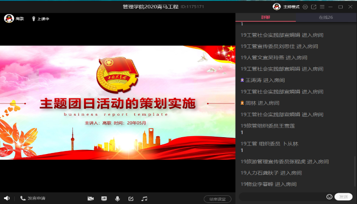 为了提高同学们对主题团日活动的重视,明确学生干部的职责与定位。5月31日,管理学院召开线上青马工程学生干部培训课程。本次课程的题目为主题团日活动的策划实施,团总支书记高歌主讲,团总支副书记周林、王涛涛及青马学员参加。