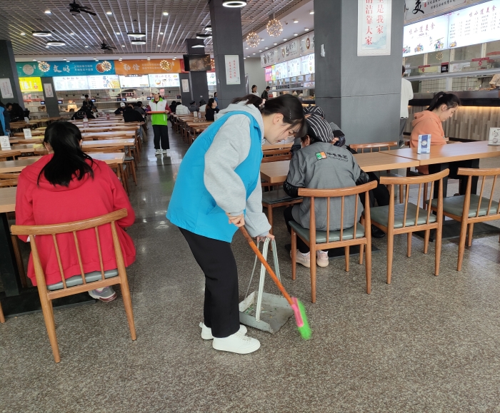 活动开始前,志愿者们先于食堂门口集合,并在领取活动服装后跟随各组负责人分别前往一食堂、三食堂两个地点开展活动。活动中,志愿者们热情高涨、干劲十足,他们不仅把饭桌上的饭粒、残渣擦干净,将食堂里的桌椅摆放整齐并用扫帚打扫地面的垃圾,清理卫生死角,就餐的同学提供了一个干净整洁的就餐环境。在志愿服务过程中,志愿者们对食堂运作有了深层次的了解的同时,也体会到了食堂工作人员的艰辛。随后,志愿者们号召同学们一起文明就餐,学会餐后自觉将餐盘送到回收处,用自己的双手为创建和谐、整洁的校园环境尽一份力量。