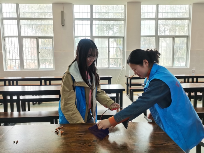 活动开始前,志愿者们先于食堂门口集合,并在领取活动服装后跟随各组负责人分别前往一食堂、三食堂两个地点开展活动。活动中,志愿者们热情高涨、干劲十足,他们不仅把饭桌上的饭粒、残渣擦干净,还将食堂里的桌椅摆放整齐并用扫帚打扫地面的垃圾,清理卫生死角,给就餐的同学提供了一个干净整洁的就餐环境。在志愿服务过程中,志愿者们在对食堂运作有了深层次的了解的同时,也体会到了食堂工作人员的艰辛。随后,志愿者们号召同学们一起文明就餐,学会餐后自觉将餐盘送到回收处,用自己的双手为创建和谐、整洁的校园环境尽一份力量。