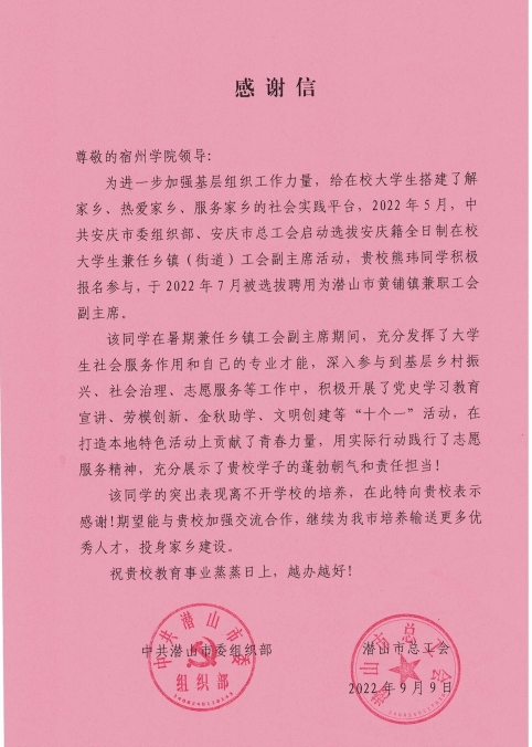 近日,中共潜山市委组织部、潜山市总工会向宿州学院发来感谢信。在感谢信中表示,宿州学院管理学院21级酒店管理1班熊玮同学在打造本地特色活动上贡献了青春力量,用实际行动践行了志愿服务精神。熊玮同学在暑假期间担任潜山市黄埔镇兼职工会副主席,为家乡建设作出了积极贡献,向宿州学院和熊玮同学表示感谢。