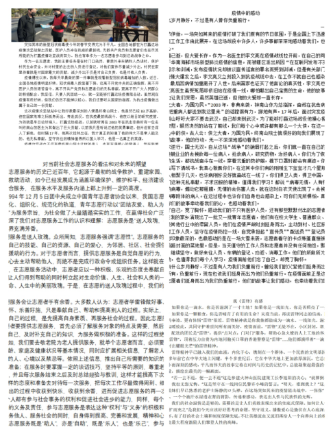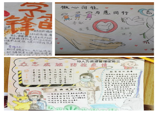 同学们看过纪录片和浏览过文章之后,有的发表当前社会志愿服务的看法和对未来的期望;有的在疫情期间担任志愿者,书写身为一名志愿者的心得感受;有的梳理志愿服务先进典型,学习战“疫”先进者的精神;有的写观看本次纪录片的心得体会;有的以雷锋精神、志愿服务或抗击疫情为主题制作手抄报。