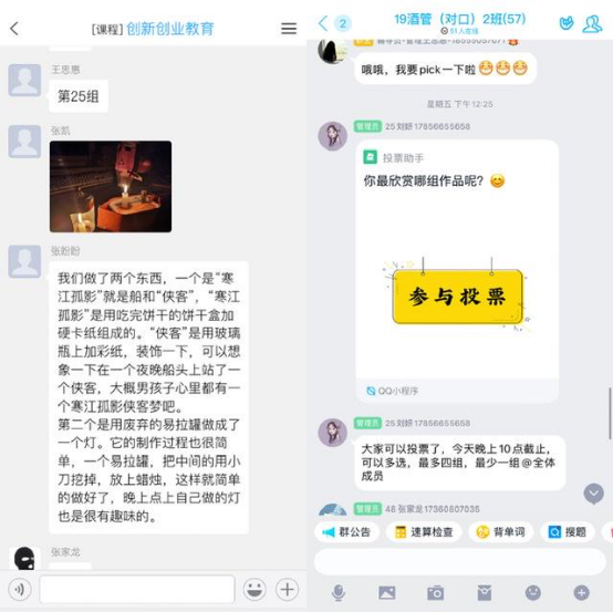 在活动开始前,辅导员就在班级群里发布了相关活动规则:利用身边的东西,废物利用,做成一个手工作品,按照学号,1号和2号两两组队,最后三个人一组,其中一人做手工,另一人对其进行讲解,包括手工作品是什么?为什么做这个?怎么做的?制作过程是什么样的?作品名称为“手工名称+学号后两位”,周五上午上课现场分组讲解,最后评出大家心中最喜欢的那个作品。活动开始时,大家纷纷开始展示自己的废物利用手工作品,同学们个个情绪高涨,他们通过丰富的想象力,把使用过的一些废旧物品霎时间都变成一件件的艺术品。最后的评选活动中,大家也纷纷为自己喜欢的作品投上了宝贵的一票。