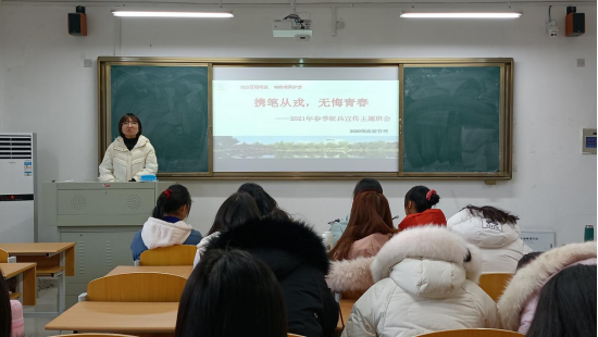为鼓励学生积极应征入伍,提高兵员征集质量,推进国防建设,应国家及学院要求,20旅游管理在实训楼C102教室召开“携笔从戎,无悔青春”2021年春季征兵宣传主题班会。辅导员巩艳艳主持本次班会,全体同学参加。