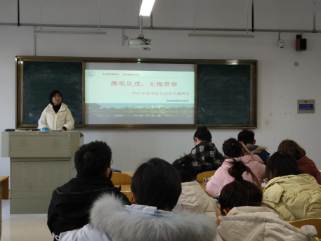 为鼓励学生积极参与应征入伍,提高兵员征集质量,推进国防和军队现代化建设,学院大力开展大学生入伍征集工作。2020年12 月21日,18酒店管理班举行了21年春季征兵的宣传主题班会,在实训楼c楼104由巩老师主持,全体18酒店管理班的同学均到场。认真聆听动员并互相交流了对大学期间参军的看法。