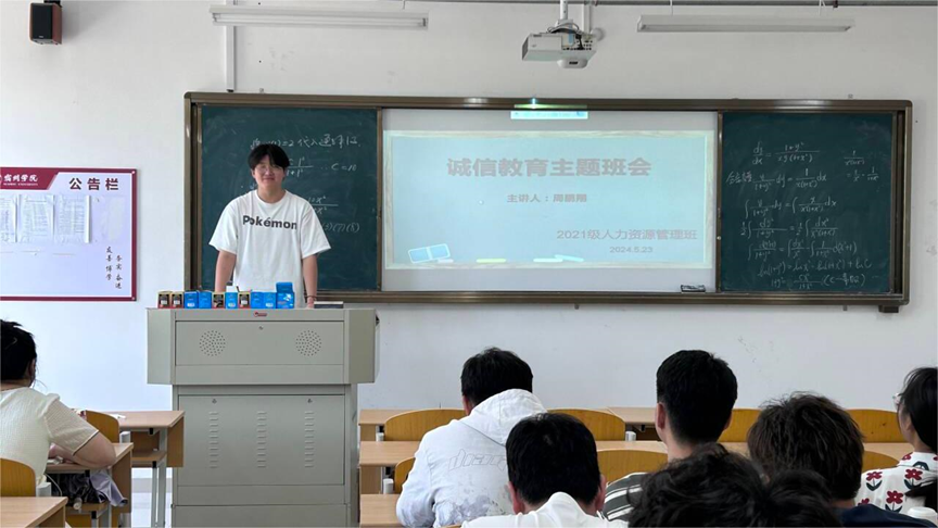 为进一步提高学生诚信意识和责任意识,帮助学生树立正确的价值观和消费观,促进学生全面发展,强化资助工作育人效果,5月23日上午,21人力资源管理班召开诚信教育主题班会,会议由生活委员周鹏翔主持,全体同学积极参与。