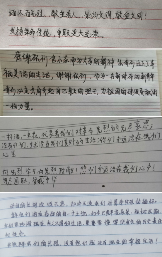 本次团日活动以默哀、观看革命烈士纪念片、书写革命寄语和居家劳动等多种形式开展,同学们还可以通过“中华英烈网”参与清明云追思活动,以网上献花的方式进行祭扫,也可以进入英烈纪念馆查看英烈事迹。