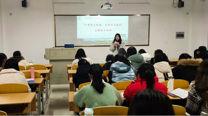 首先,董佳主持召开“严肃学习纪律,加强学风建设”主题班会。文宣委员赵飞飞发表开幕致辞后,由组织委员李可带领大家进行考场诚信宣誓。宣誓声字字清晰,铿锵有力,充分流露出同学们严肃考风考纪、树立优良学风的决心。董佳总结到,学风是读书之风,考风更是做人之风,是体现一个班级风气好坏、纪律松严的重要特征;倡导良好学风,大学生是直接营造者,也是直接受益者,希望同学们在未来的学风建设及班级发展中贯彻落实、共同努力。接着,活动进行至第二环节,各小组派出一名代表上台,向大家展示并讲解本组制定的期末考试目标及学科复习计划。由于冬季疫情防控的需要,课程进度加快,期末考试也将提前到来。此次活动可以帮助大家明确学习目标,写下复习计划,时时提醒自己,时时鞭策自己。最后,班长沈玮洁为大家播放关于学习主题的励志视频,激励大家能够在接下来为数不多的日子里脚踏实地、按时复习,在期末考试中取得不负初心、令人满意的成绩。