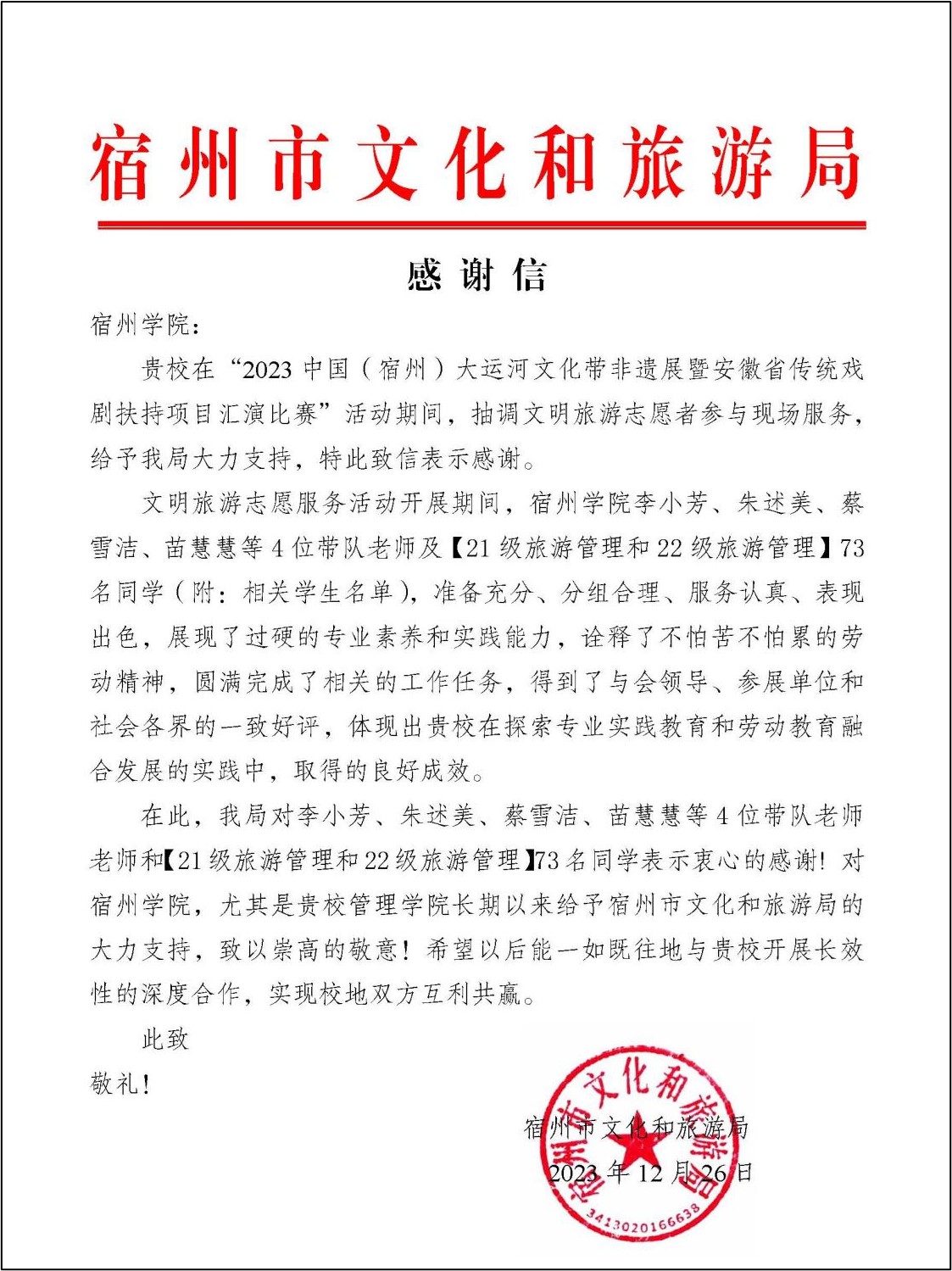 12月26日,宿州市文化和旅游局发来感谢信,专门就管理学院李小芳、朱述美、蔡雪洁、苗慧慧4位老师及21级旅游管理和22级旅游管理班73名同学在“2023中国(宿州)大运河文化带非遗展暨安徽省传统戏剧扶持项目汇演比赛”活动中的大力支持和出色表现致信感谢。